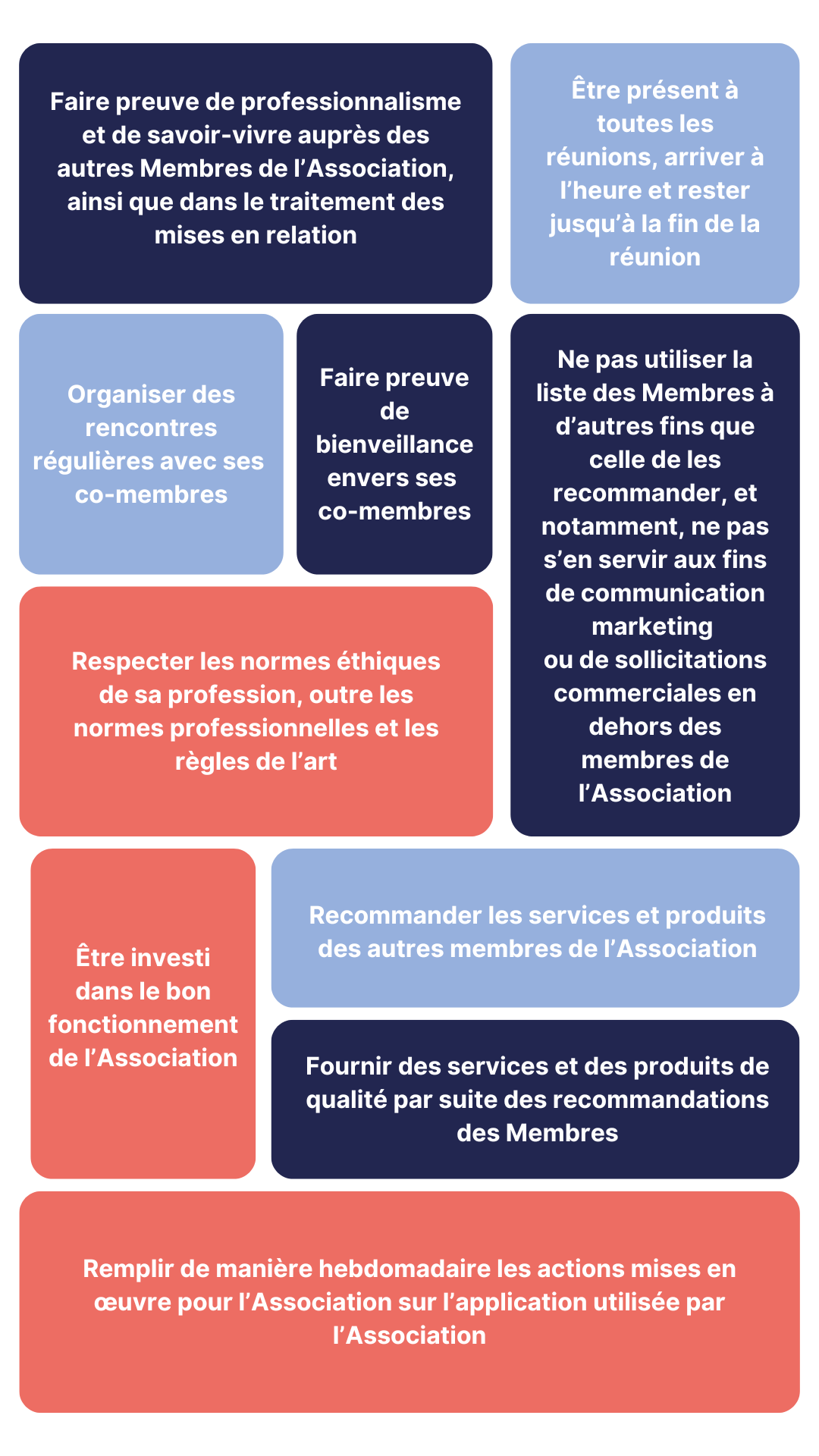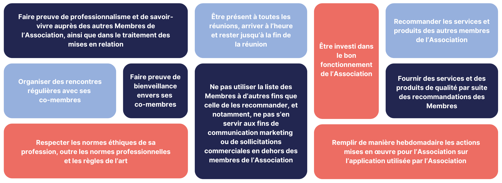 Chaque Membre Actif, en adhérant à l’Association, s’engage à :